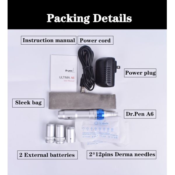 Packaging Details : (1 Dr Pen A6 Machine +2 external batteries+ 1 Charger Plug+ 1 Connection Cable+2 Free DermaNeedles)